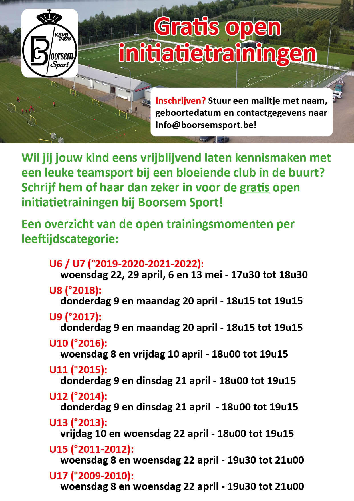Heb je interesse om aan te sluiten bij Boorsem Sport? Dat kan! Neem gerust vrijblijvend contact op met onze jeugdverantwoordelijke Rudi Panis. Hij verschaft u met veel plezier de nodige informatie. In de rubriek 'jeugdwerking' elders op deze website vindt u ook alvast heel wat info over onze club!